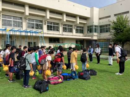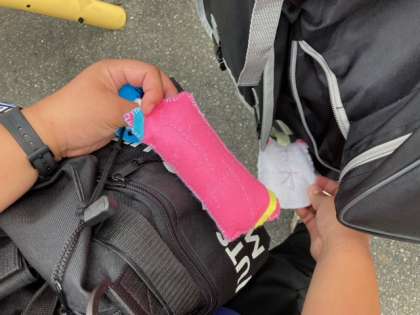 家庭科の時間にフェルトで作った名札も付けていざ出発!