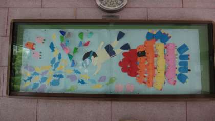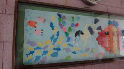 7月の玄関掲示は水の中の世界です。子どもたちは、カラフルな魚を見て楽しんでいました。