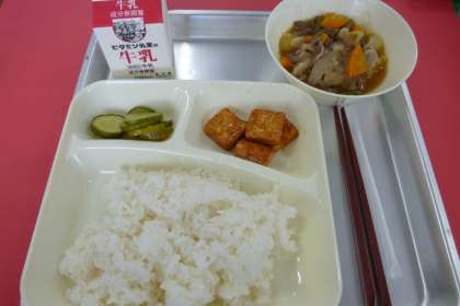 肉じゃがは、お出汁がきき、子ども達にも人気のメニューでした。厚揚げは、お味噌がしっかり絡み、きゅうりはさっぱり味。ごはんがすすむ給食でした。