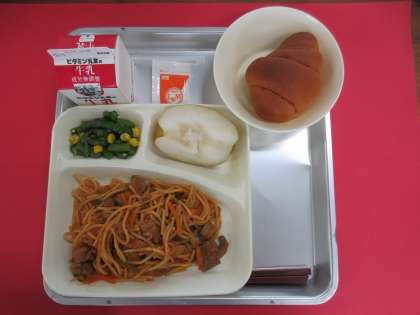 今日の献立は、イタリアンスパゲッティ、グリーンアスパラガスのサラダ、ノンエッグドレッシング、なし(豊水)、1/2黒糖パン、牛乳です。
