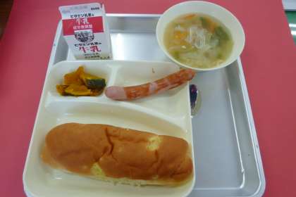 今日の献立は、ウインナーのケチャップソース、スープ、焼きかぼちゃ、おさつパン、牛乳です。