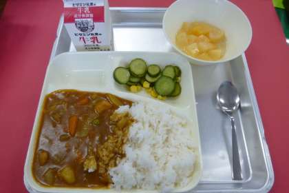 今日の献立は、チキンカレーライス(米粉)、ごはん、きゅうりとコーンのサラダ、カット白桃の缶詰、牛乳です。