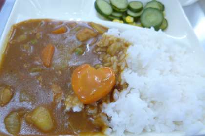 今日のチキンカレーライス。給食調理員さんからのサプライズ!ハート形のラッキーにんじんが入っていました。みんなのカレーには入っていたかな?