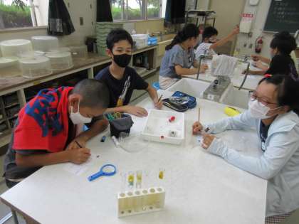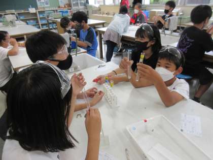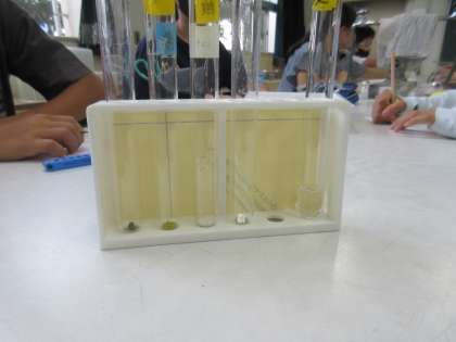 鉄とアルミニウムを試験管に入れ、うすい塩酸を注ぎます。