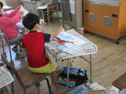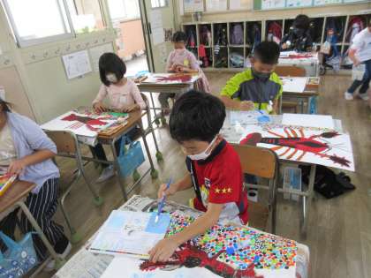 教室で育てているザリガニの絵を画用紙いっぱいに描きました。