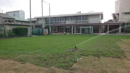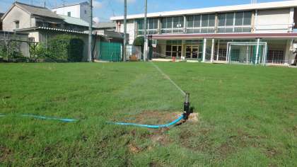講堂側に移した芝生の散水は、今回設置したスプリンクラーが作動しています。ここのところ太陽も十分照っているので芝生は青々としています。