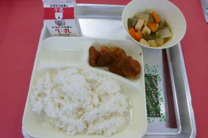 今日の献立は、みそカツ、じゃがいもと野菜の煮物、焼きのり、ごはん、牛乳です。