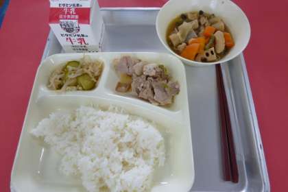 今日の献立は、豚肉のねぎじょうゆ焼き、ふきよせ煮、きゅうりともやしの甘酢あえ、ごはん、牛乳です。