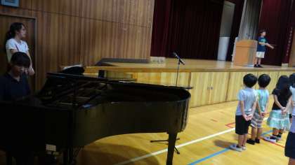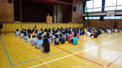 暴風警報が解除になったので、予定通り終業式を行いました。校長先生や生活指導の先生などの話を聞きました。その後、校歌を元気よく歌い終業式を終えました。