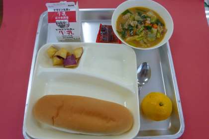 今日の献立は、豚肉といかの中華煮、大学いも、みかん、パン、いちごジャム、牛乳です。