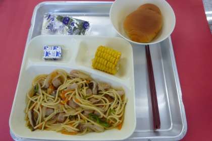 今日の献立は、ウインナーときのこの和風スパゲティ、きざみのり、焼きとうもろこし、固形チーズ、1/2黒糖パン、牛乳です。