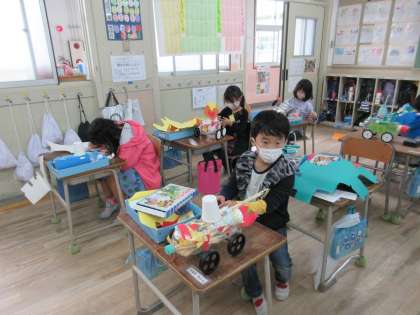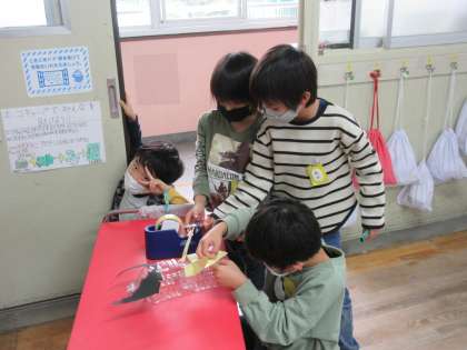 ペットボトルにタイヤをつけて、走る車を作っています。
