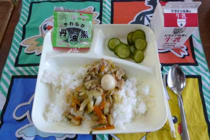 今日の献立は、中華丼(ごはん)、きゅうりのピリ辛あえ、ソフト黒豆、牛乳です。
