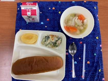今日の献立は、ほうれん草のグラタン、スープ煮、白桃(缶)、黒糖パン、牛乳です。