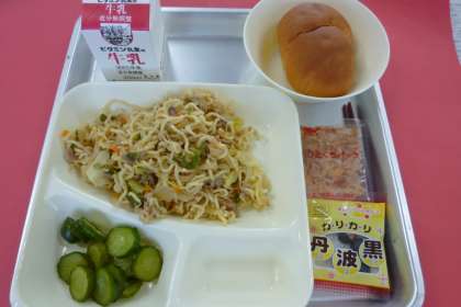 今日の献立は、和風焼きそば、きゅうりのしょうがづけ、いり黒豆、1/2黒糖パン、牛乳です。