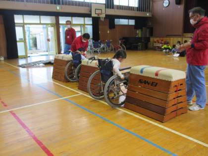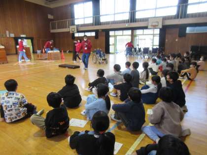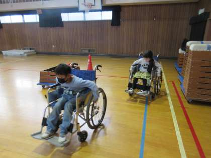 障がい者センターの方に来ていただいて、車いす体験をしました。