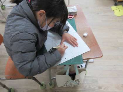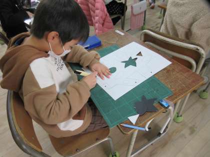 黒い画用紙を切り抜いて、色セロファンを貼って仕上げます。