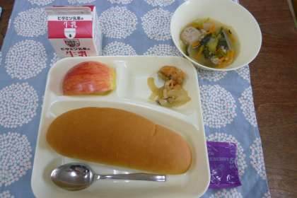今日の献立は、さけのマリネ、肉だんごと麦のスープ、りんご、パン、ブルーベリージャム、牛乳です。