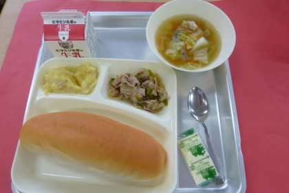 今日の献立は、豚肉と野菜のソテー、スープ、スイートポテト、コッペパン、マーガリン、牛乳です。