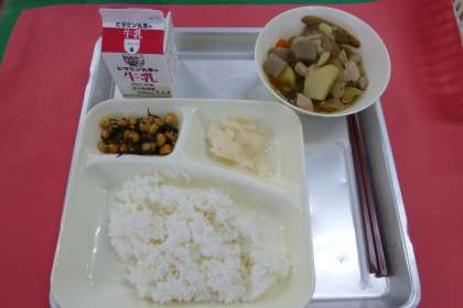 今日の献立は、鶏肉と野菜の煮もの、ひじき豆、かぶのゆず風味、ごはん、牛乳です。