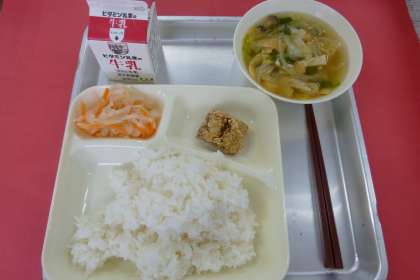 今日の献立は、さばのカレーたつたあげ、五目汁、紅白なます、ごはん、牛乳です。