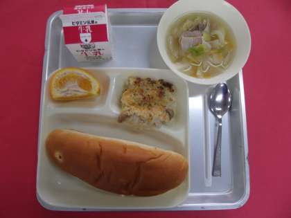 今日の献立は、押麦のグラタン、豚肉と野菜のスープ、いよかん、おさつパン、牛乳です。