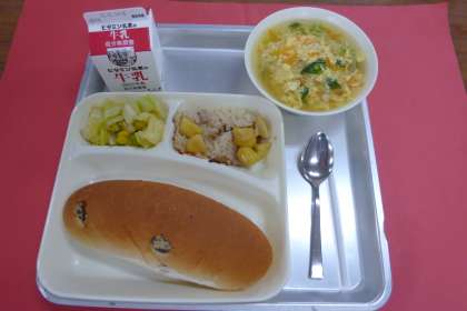 今日の献立は、中華おこわ、卵スープ(卵の個別対応献立)、キャベツのオイスターソースいため、レーズンパン、牛乳です。