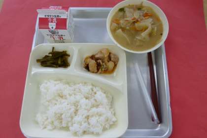 今日の献立は、まぐろの甘辛焼き、豚汁、くきわかめのつくだ煮、ごはん、牛乳です。