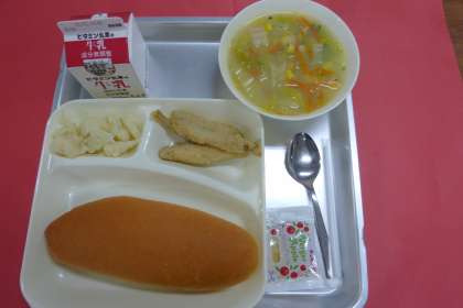 今日の献立は、わかさぎフライ、コーンとはくさいのスープ、カリフラワーのサラダ、コッペパン、りんごジャム、牛乳です。