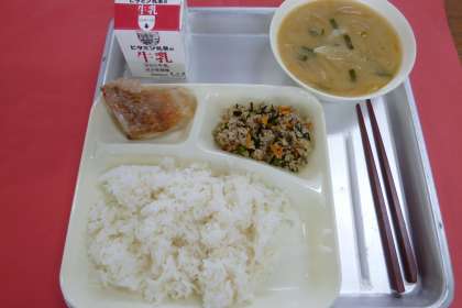 今日の献立は、あかうおのレモンじょうゆかけ、みそ汁、高野どうふのいり煮、ごはん、牛乳です。