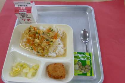 今日の献立は、カツ丼(ごはん)、はくさいの甘酢あえ、まっ茶大豆、牛乳です。