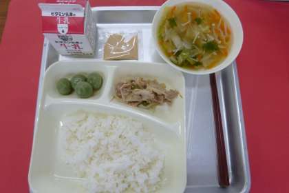 今日の献立は、豚肉と野菜のいためもの、すまし汁、きな粉よもぎだんご、ごはん、牛乳です。