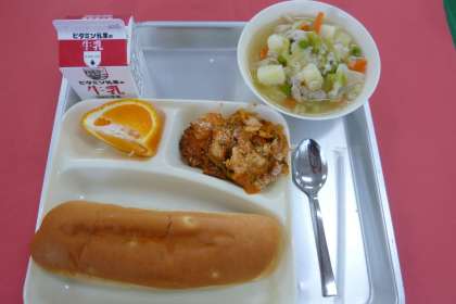 今日の献立は、とうふのミートグラタン、押麦と野菜のスープ煮、デコポン、おさつパン、牛乳です。