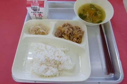 今日の献立は、豚肉のコチジャンいため、鶏肉とはるさめのスープ、もやしのナムル、ごはん、牛乳です。