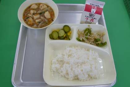 今日の献立は、マーボーどうふ、きゅうりとコーンの甘酢あえ、もやしとピーマンのごまいため、ごはん、牛乳です。