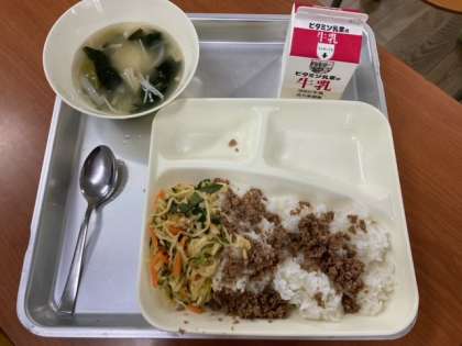 『ビビンバ』は、韓国・朝鮮料理で、「ピビム」と「パプ」という言葉から名前がつきました。「ピビム」は「まぜる」、「パプ」は「「ごはん」という意味です。ナムルや肉などの具をごはんの上にのせ、よくまぜて食べます。給食では、牛と豚のひき肉、切り干しだいこん、にんじん、きゅうりなどが入っています。