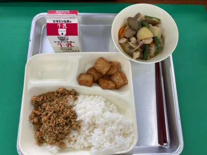 今日の献立は、鶏肉とじゃがいもの煮もの、あつあげのしょうゆだれかけ、紅ざけそぼろ、ごはん、牛乳です。