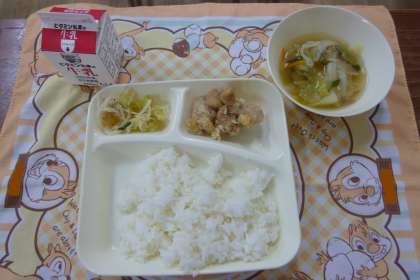 今日の献立は、鶏肉のからあげ、中華スープ、チンゲンサイともやしの甘酢あえ、ごはん、牛乳です。