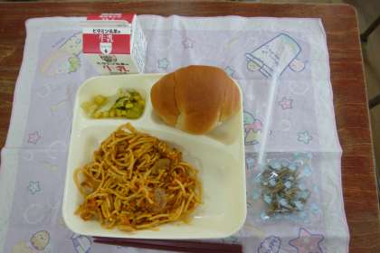 今日の献立は、ミートソーススパゲッティ、レタスとコーンのサラダ、ミニフィッシュ、黒糖パン(1/2)、牛乳です。