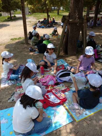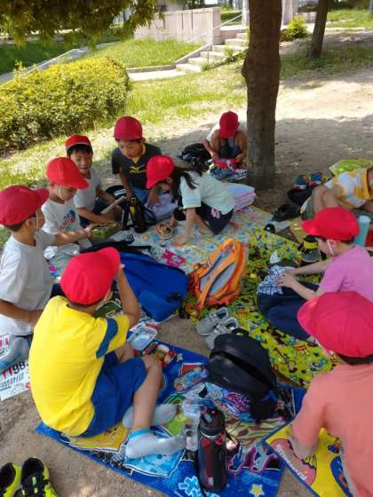 キッズプラザを出て、となりの扇町公園でお弁当タイムです。同じ学年の友だちと楽しそうに食べています。