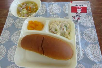 今日の献立は、マカロニグラタン、キャベツのスープ、みかん(缶詰)、黒糖パン、牛乳です。