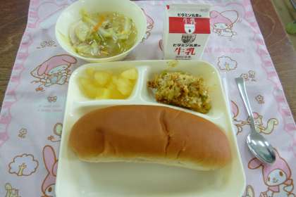 今日の献立は、カレードリア、豚肉とキャベツのスープ、りんご(カット缶)、黒糖パン、牛乳です。