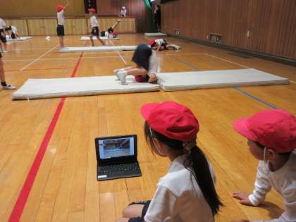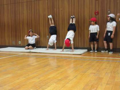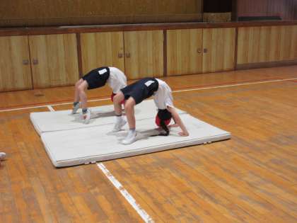 ブリッジ、肩倒立、前転、壁倒立のコーナーに分かれて