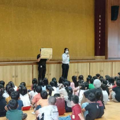 訓練終了後には全員が講堂に集合し、おまわりさんから「一人では遊ばない」「知らない人にはついて行かない」といった『5つの約束』についてのお話を聞きました。