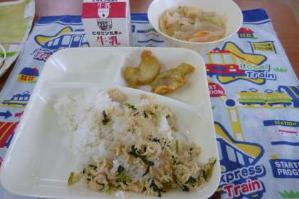 今日の献立は、白身魚のフリッター、すまし汁、とりなっ葉いため、ごはん、牛乳です。