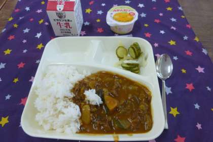 今日の献立は、夏野菜のカレーライス(ごはん)、キャベツときゅうりのサラダ、みかんゼリー、牛乳です。
