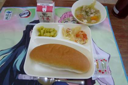 今日の献立は、鶏肉とてぼ豆のスープ、じゃがいもとトマトのチーズ焼き、グリーンアスパラガスとコーンのサラダ、コッペパン、りんごジャム、牛乳です。