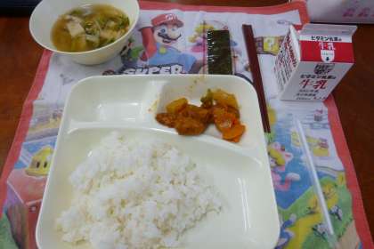 今日の献立は、酢豚、中華みそスープ、焼きのり、ごはん、牛乳です。