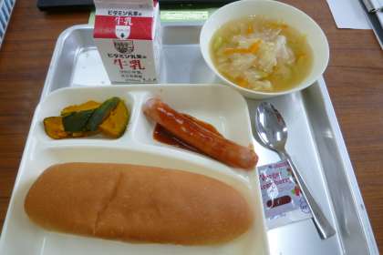 今日の献立は、ウインナーのケチャップソース、スープ、焼きかぼちゃ、パン、いちごジャム、牛乳です。