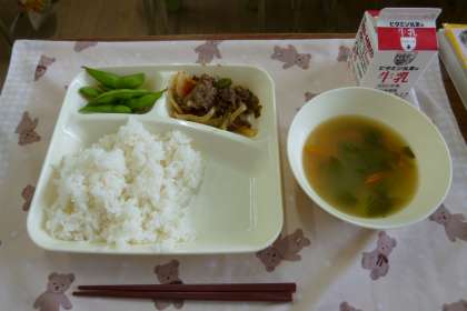 今日の献立は、プルコギ、トック、えだまめ、ごはん、牛乳です。